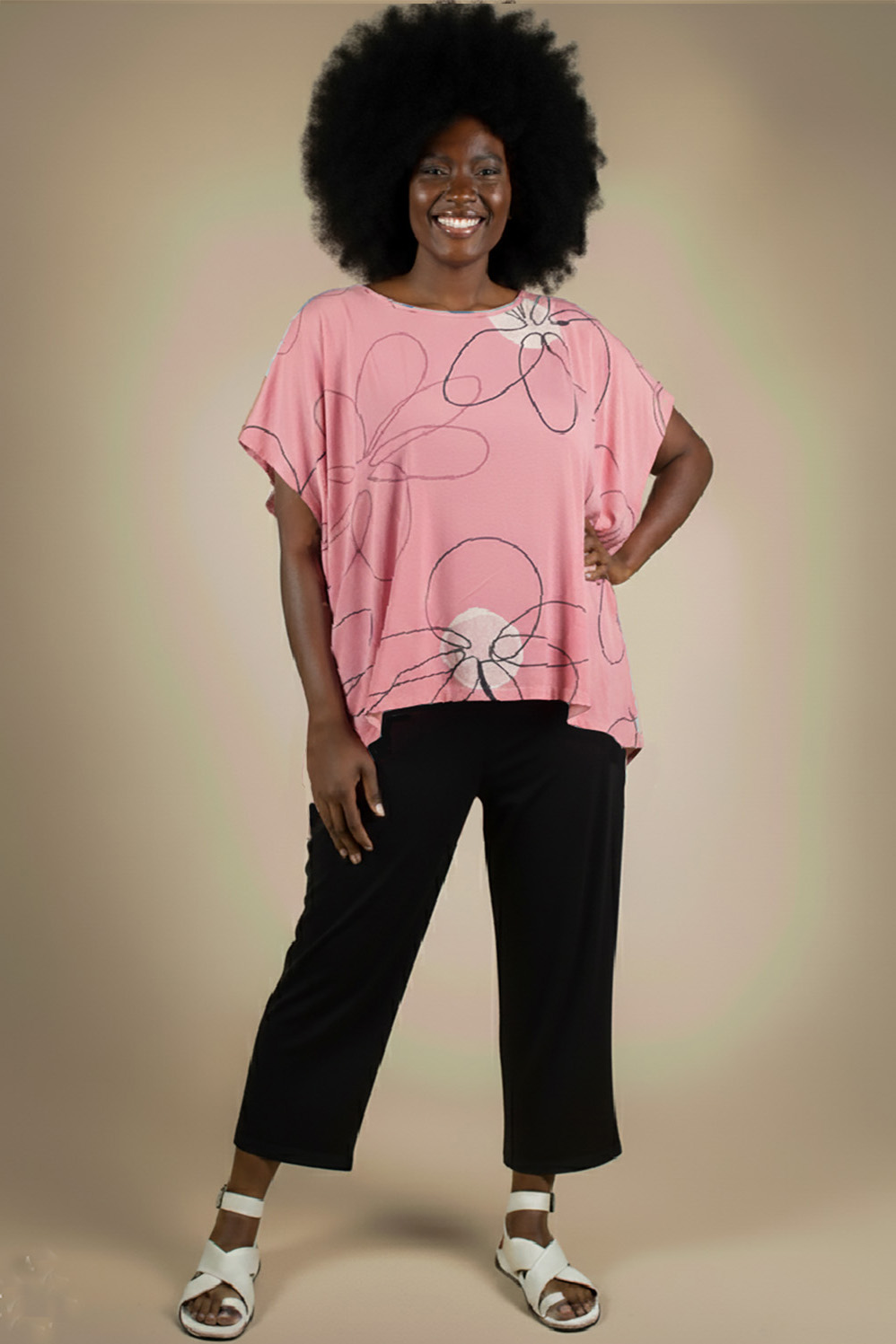 BLUSA PLUS SIZE PINTADA À MÃO SOLTONA COM DECOTE V E DETALHE DE FRANZIDO NAS COSTAS