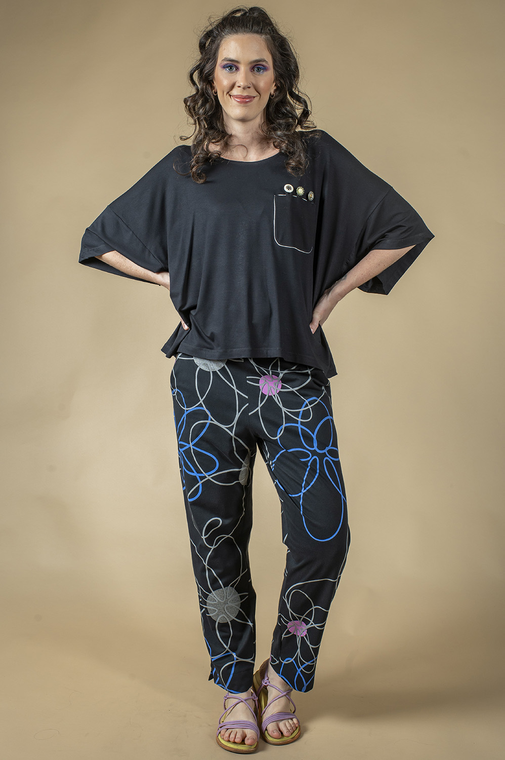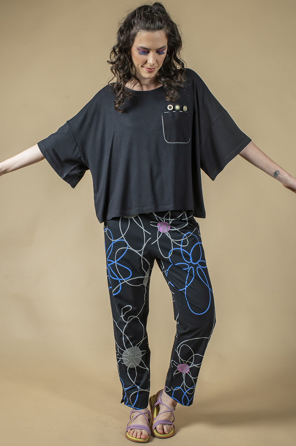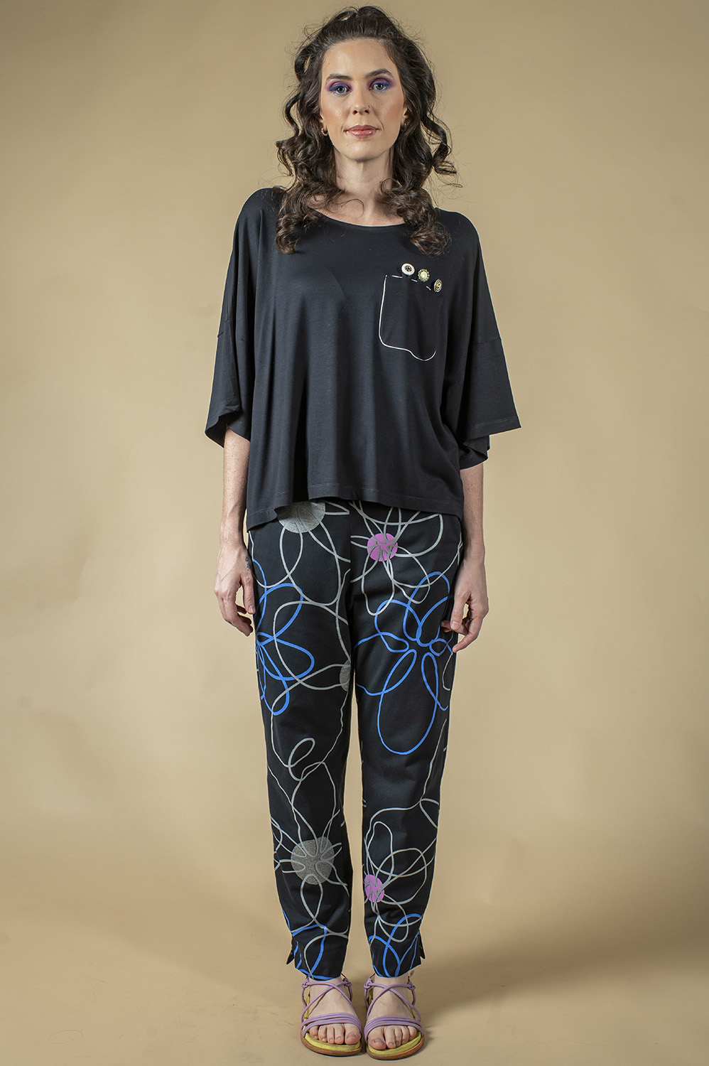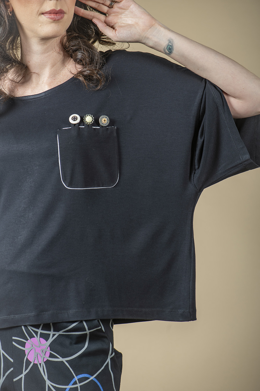 BLUSA QUADRADA TIPO T-SHIRT COM AMARRAÇÃO DE BOTÃO NO PESCOÇO E CUSTOMIZAÇÃO DE BOLSO NA FRENTE COM DETALHE DE 3 BOTÕES