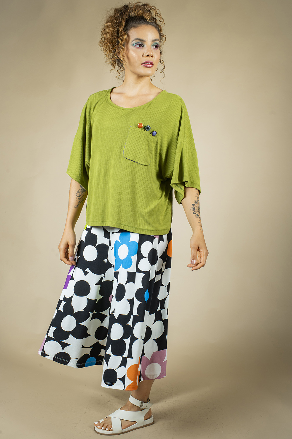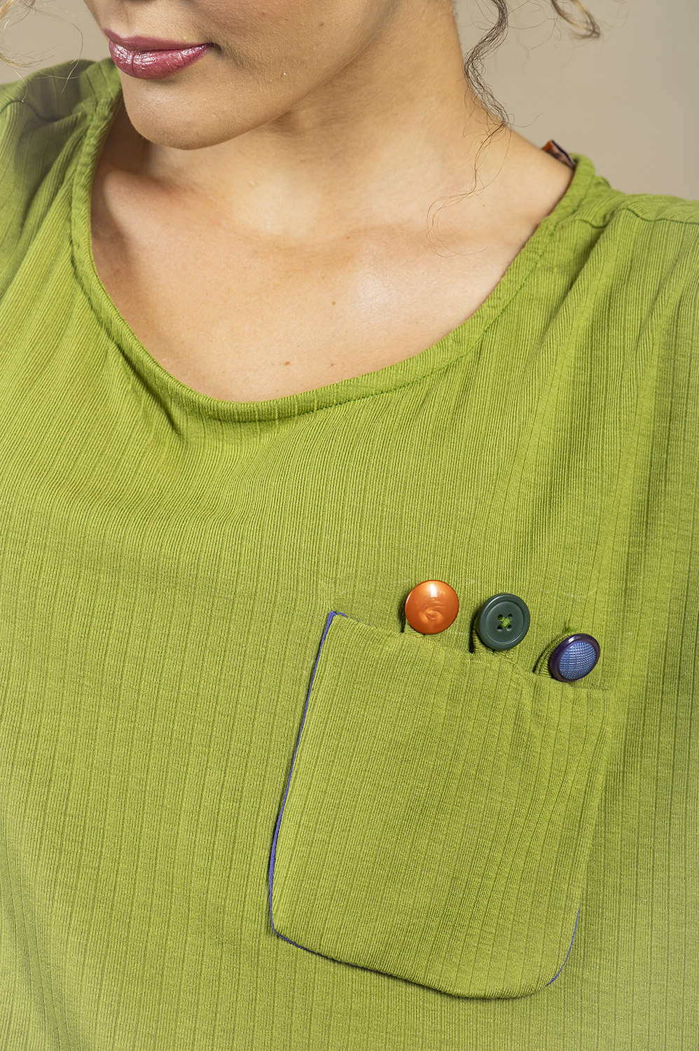 BLUSA QUADRADA TIPO T-SHIRT COM AMARRAÇÃO DE BOTÃO NO PESCOÇO E CUSTOMIZAÇÃO DE BOLSO NA FRENTE COM DETALHE DE 3 BOTÕES