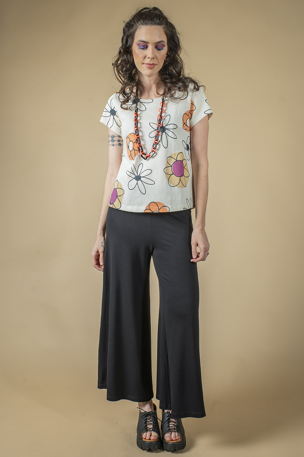 COMPOSIÇÃO: 68% viscose 30% linho 2% elastano – TECIDO PLANO COM ESTAMPA EM SILKSCREEN (TÉCNICA ARTESANAL)