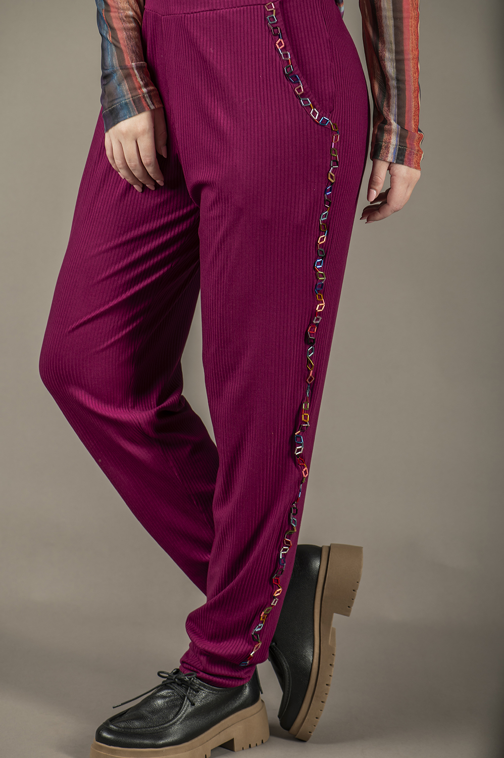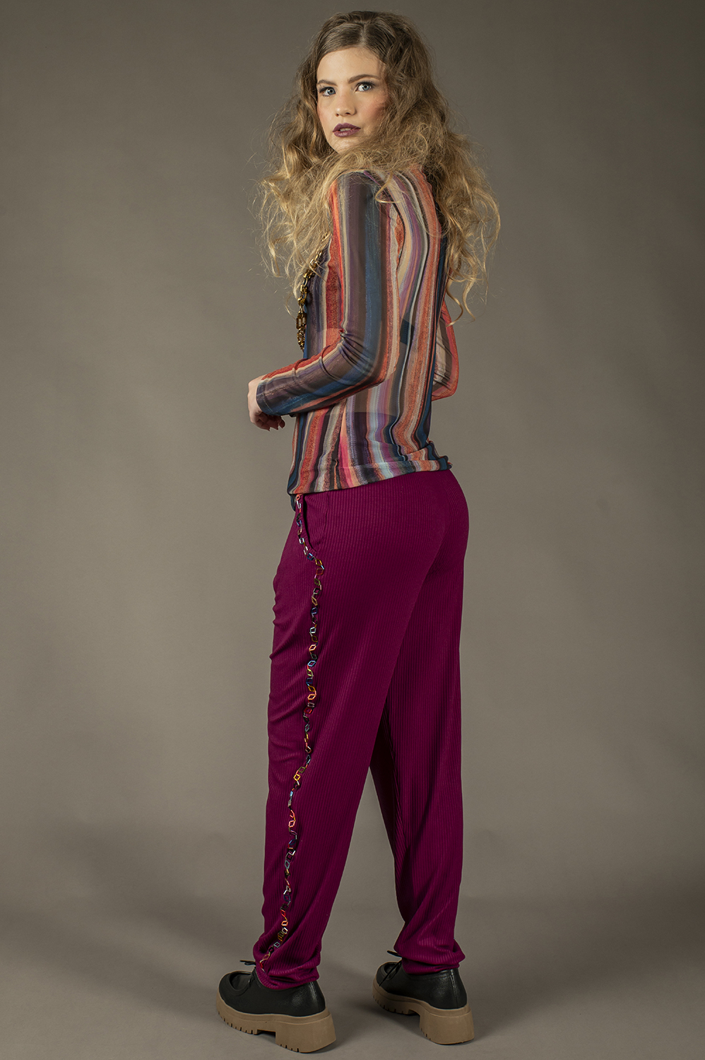 CALÇA COM APLICAÇÃO ARTESANAL DE VIDRILHOS, TIPO CONFY, SOLTINHA