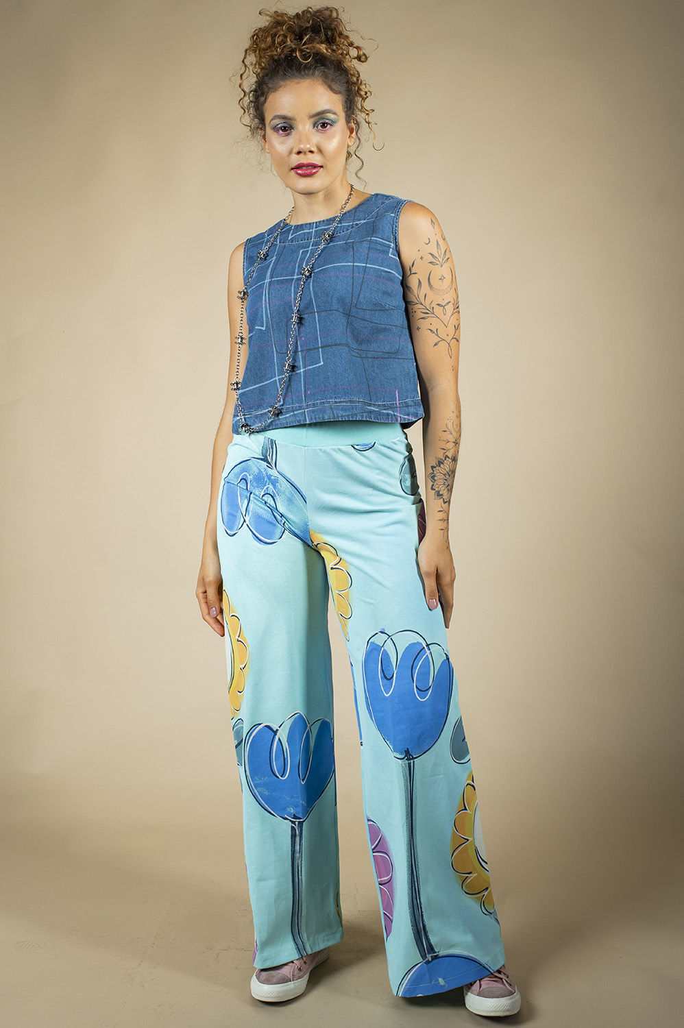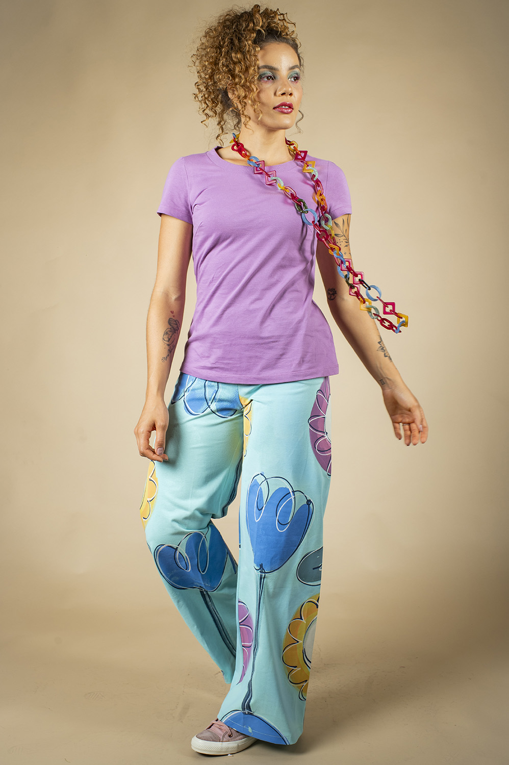 CALÇA PINTADA À MÃO, RETA SEM COSTURA LATERAL COM CÓS DE ELÁSTICO