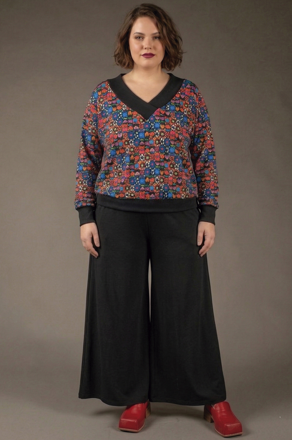 CALÇA PLUS SIZE DE PATCHWORK PESCADOR COM ELÁSTICO NO CÓS, BOLSOS E DETALHE DE FENDINHA NA BARRA