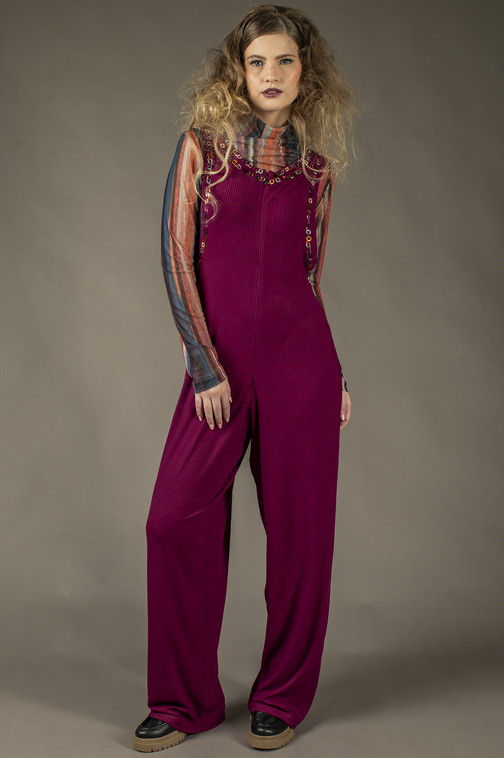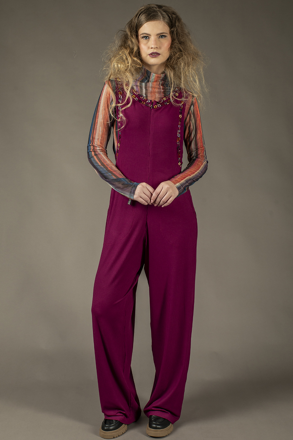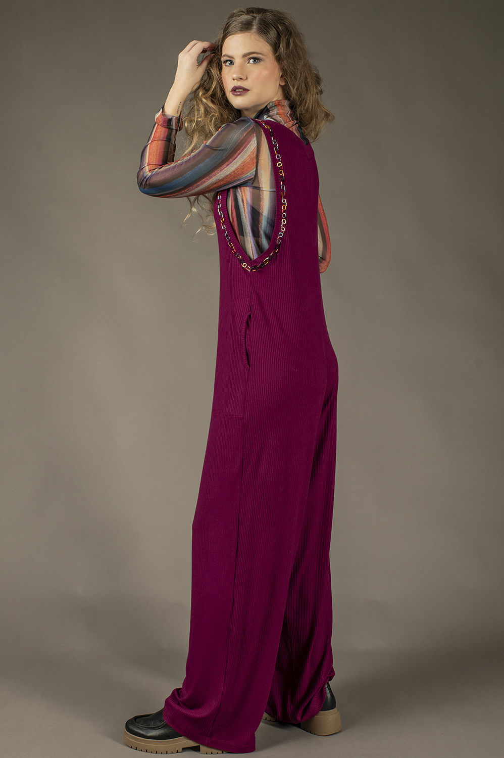 MACACÃO COM APLICAÇÃO ARTESANAL DE VIDRILHOS, RETO, SOLTINHO, REGATA, COM SUPER CAVA, ZÍPER FRONTAL E BOLSOS