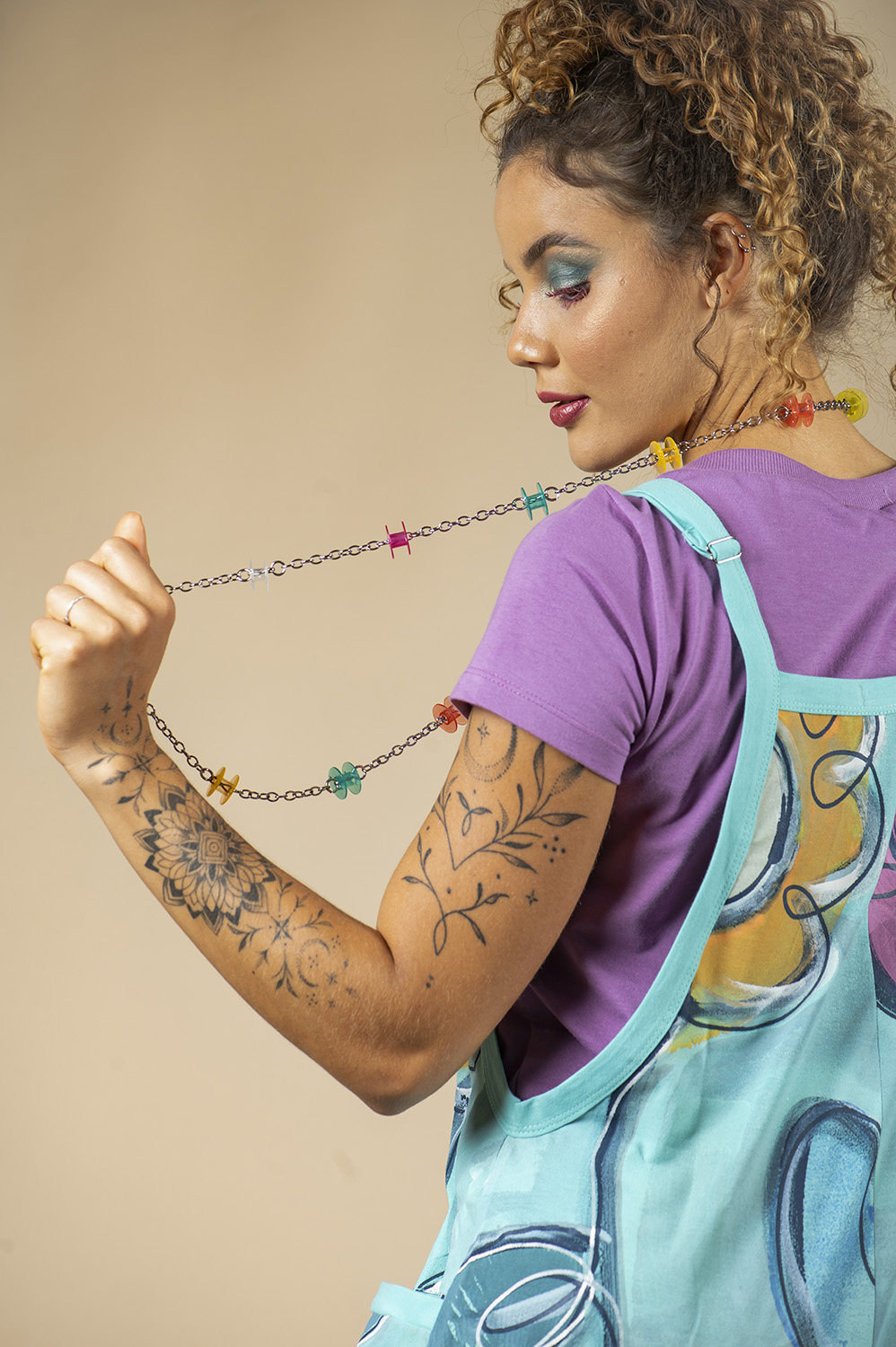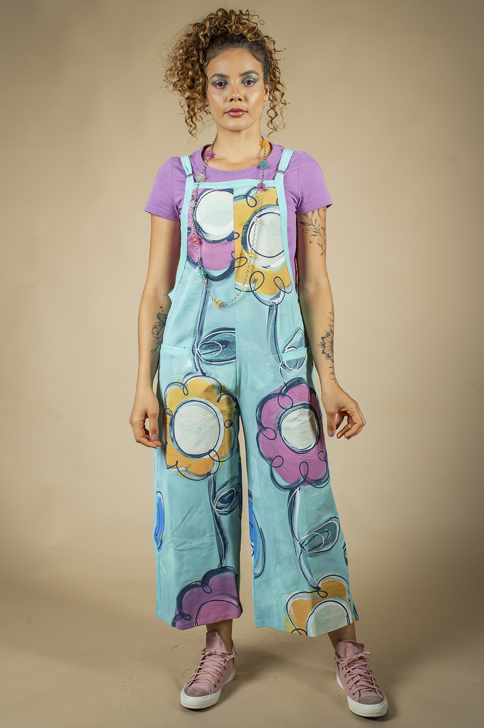 MACACÃO PINTADO À MÃO TIPO JARDINEIRA, PANTACOURT DE ALÇA COM BOLSOS FRONTAIS