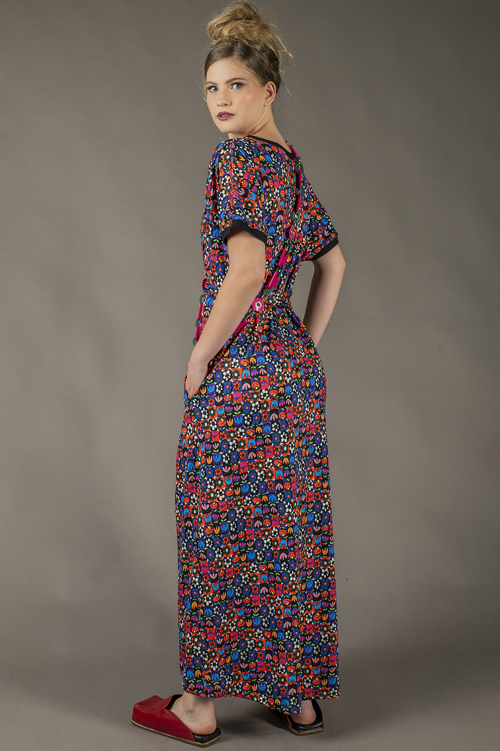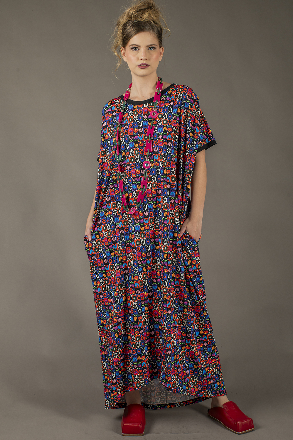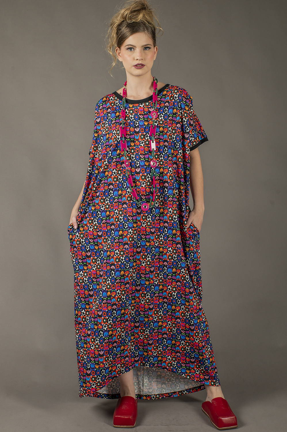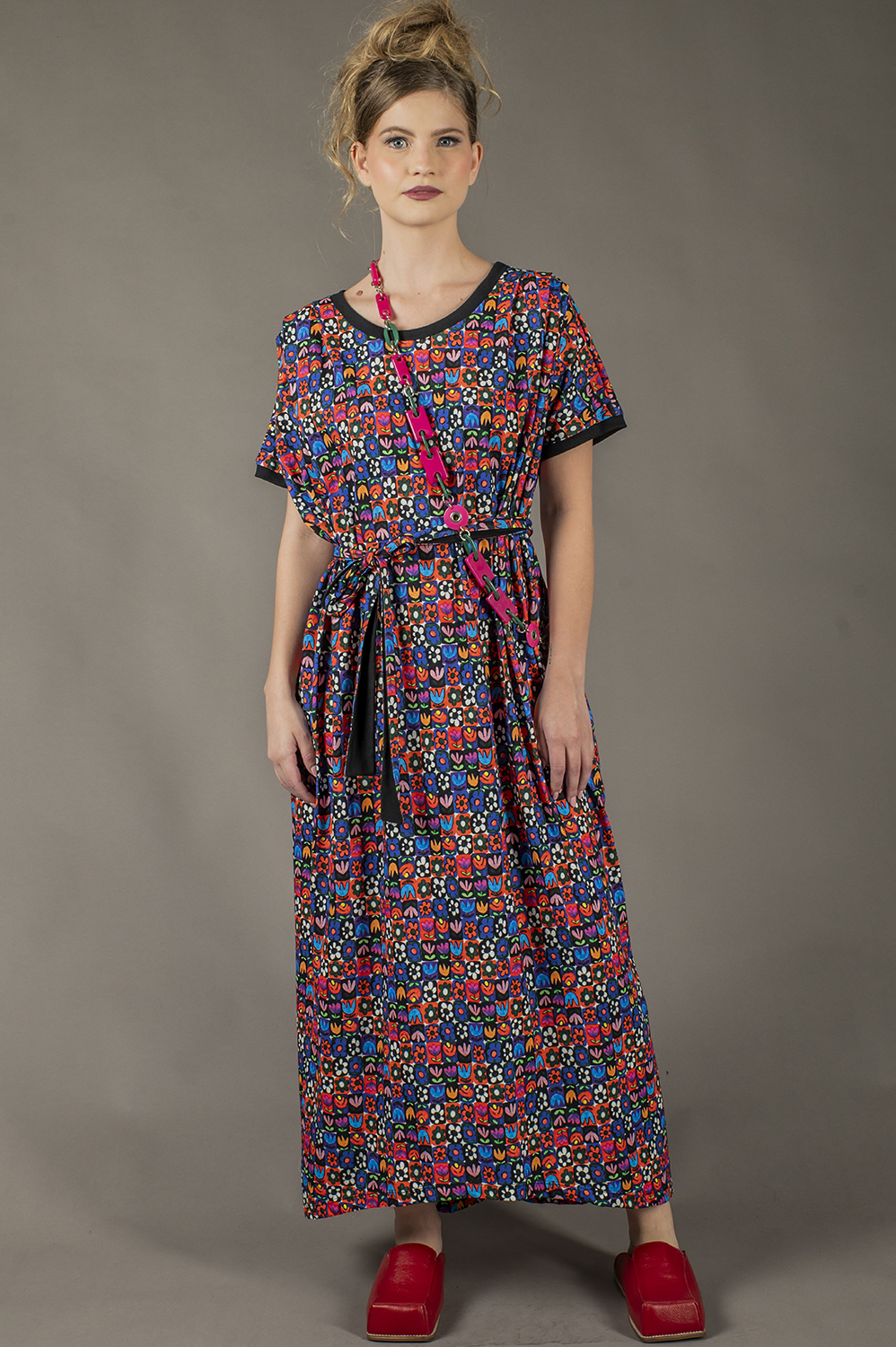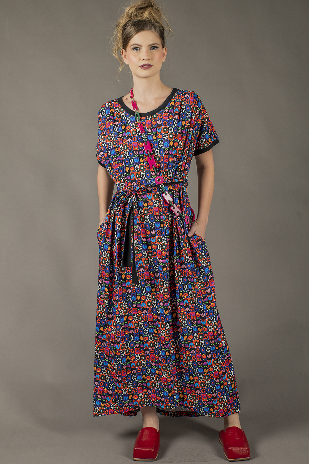 VESTIDO ALL SIZES SUPER AMPLO, COM DETALHE DE PREGAS NO OMBRO E AMARRAÇÃO NA CINTURA