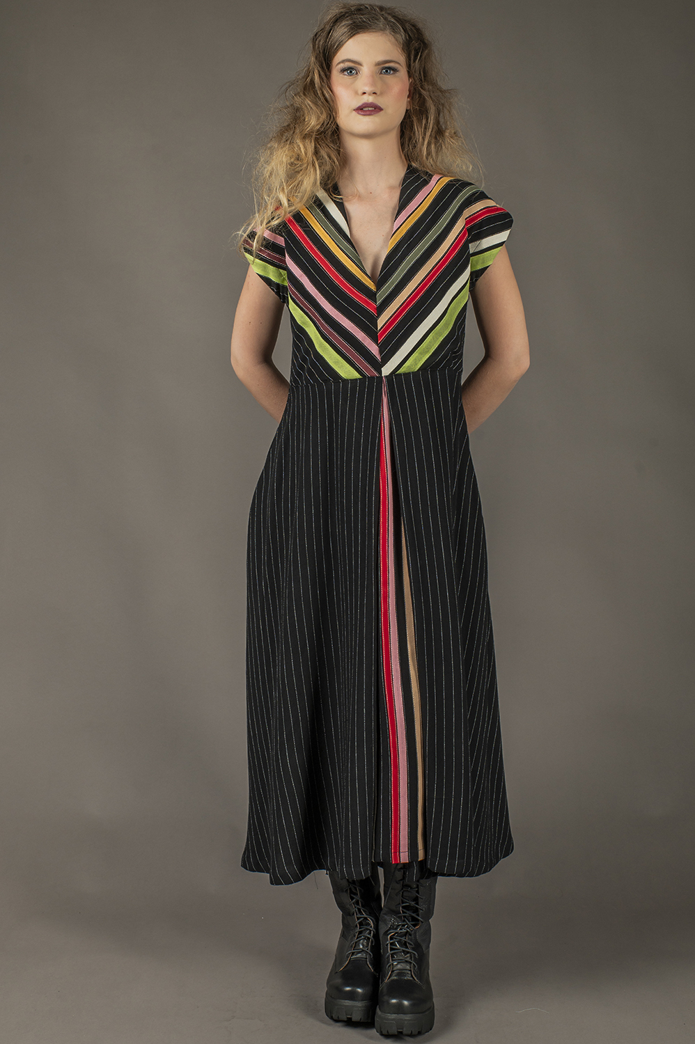 VESTIDO COM CUSTOMIZAÇÃO DE APLICAÇÃO DE VIES, MIDI, LINHA A, COM MANGA JAPONESA, DECOTE REDONDO E DETALHE DE PREGA NA FRENTE