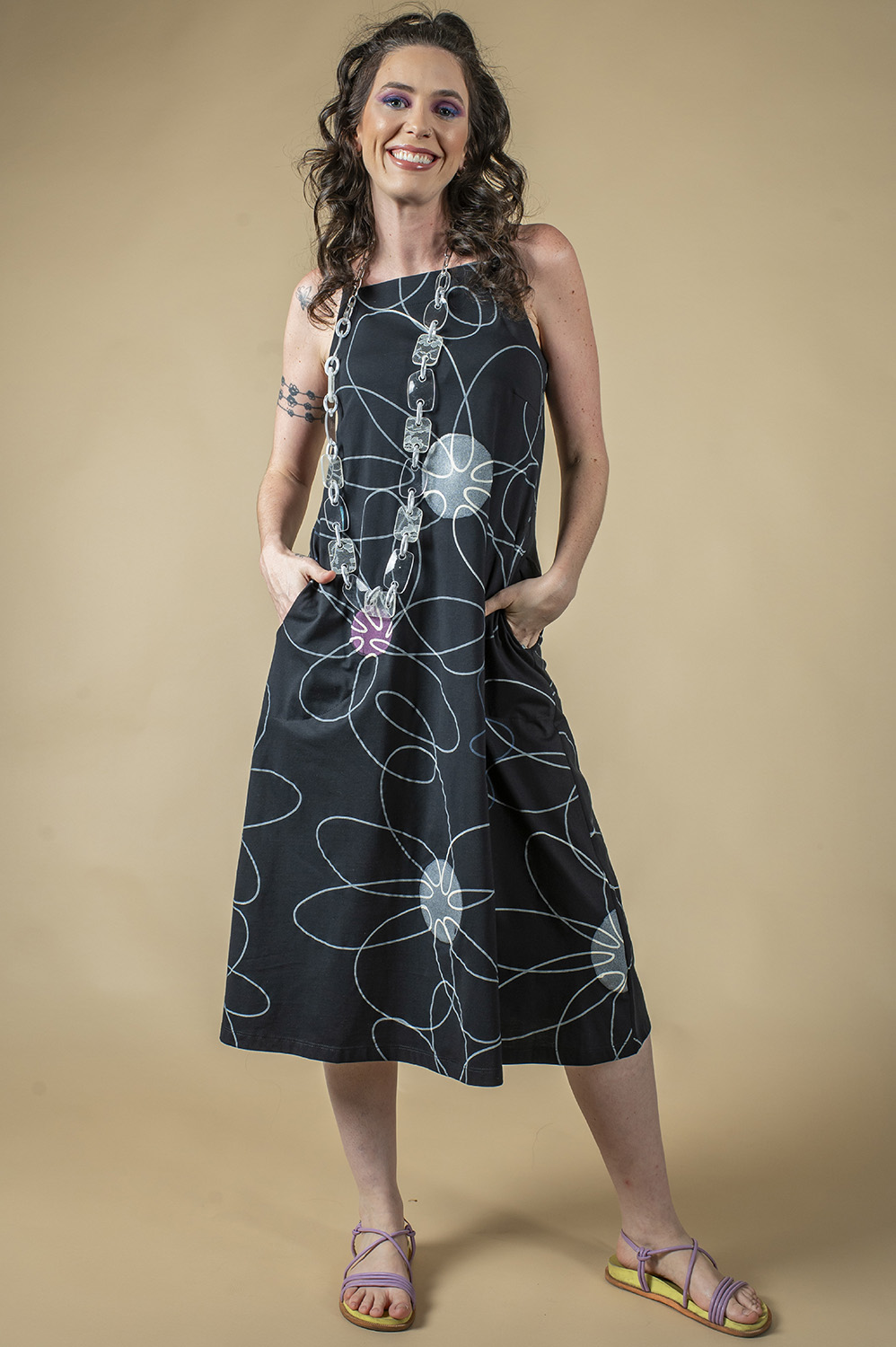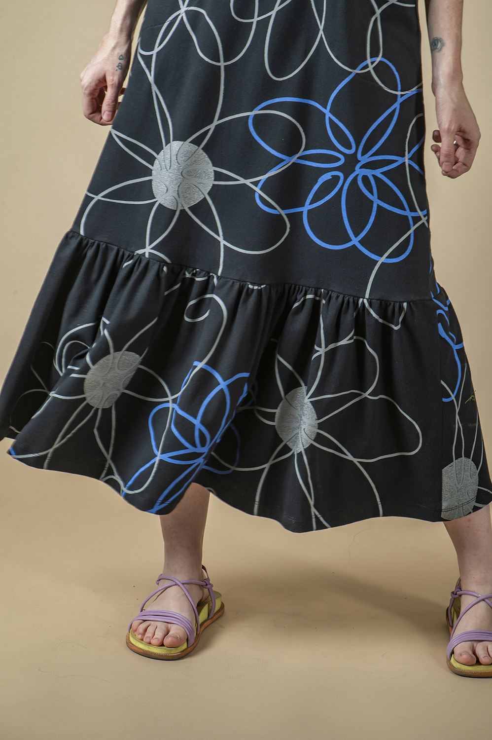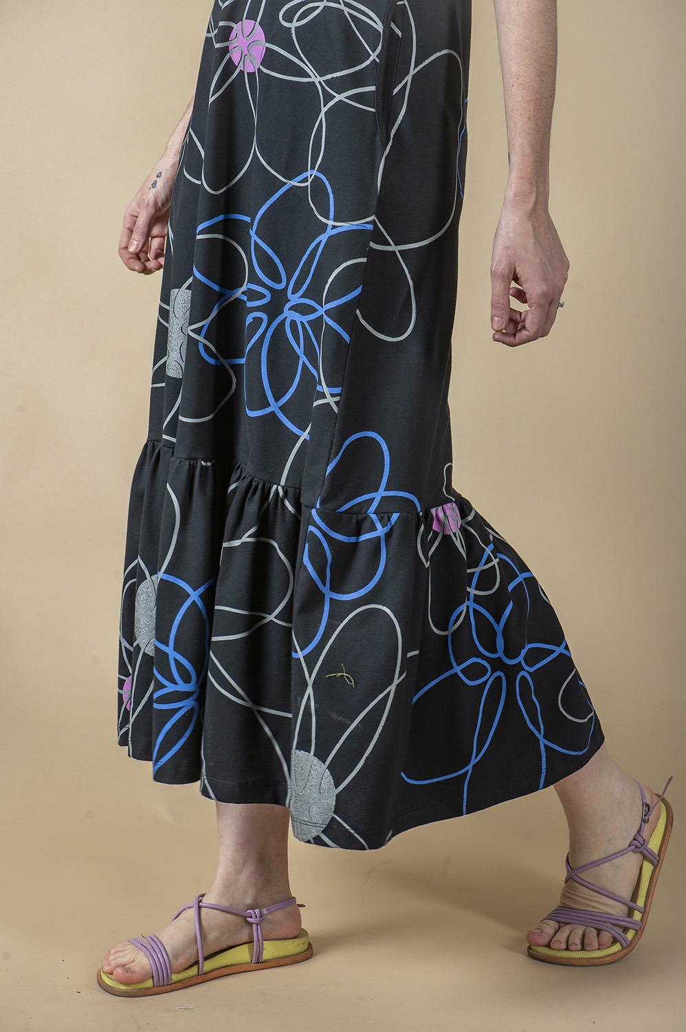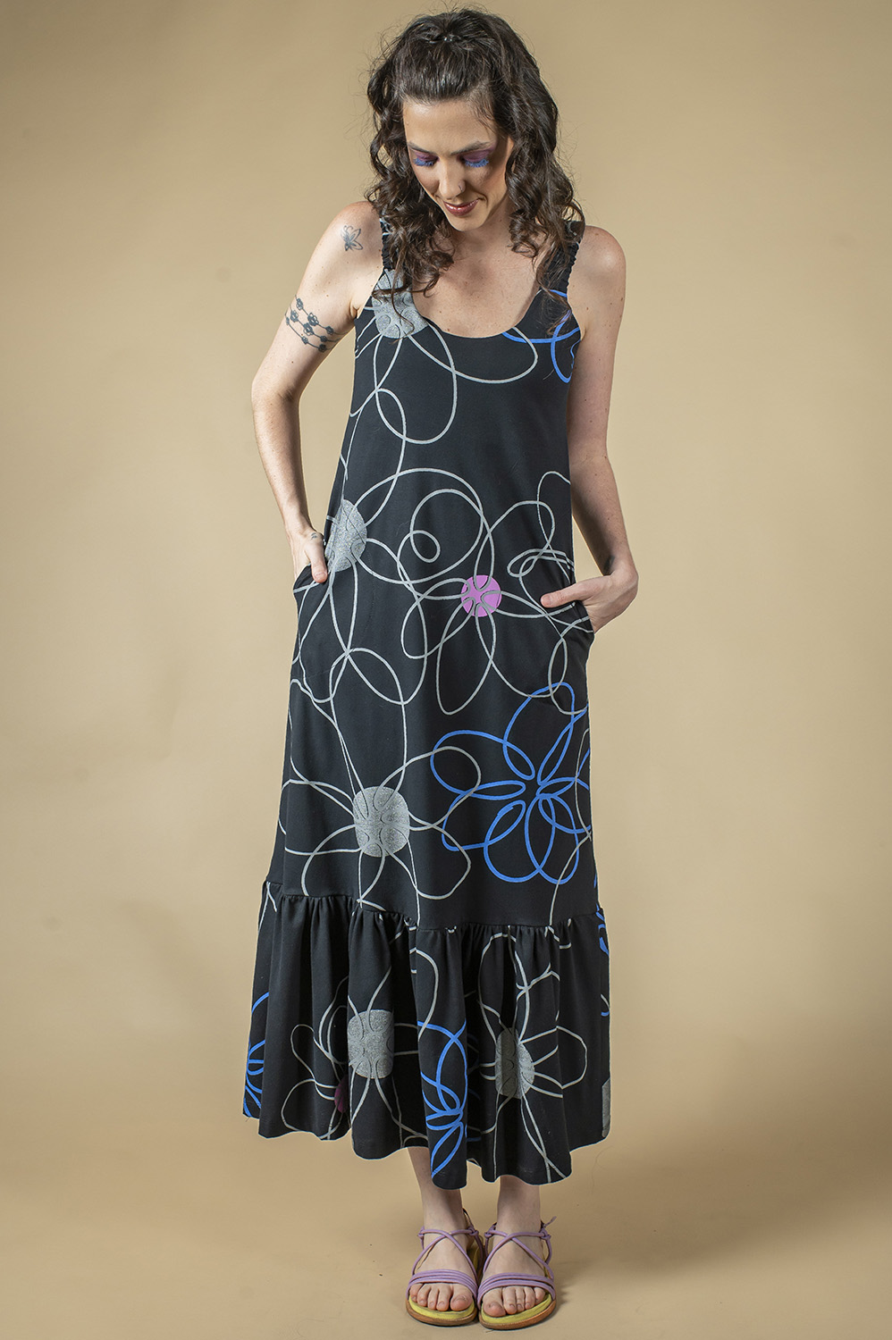 VESTIDO LONGO RETO TIPO ANÁGUA COM BARRADO FRANZIDO