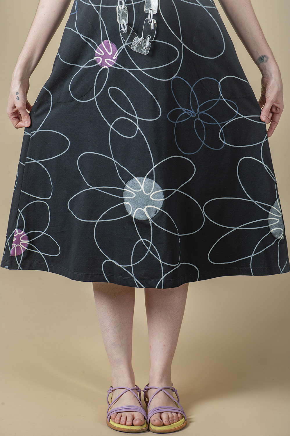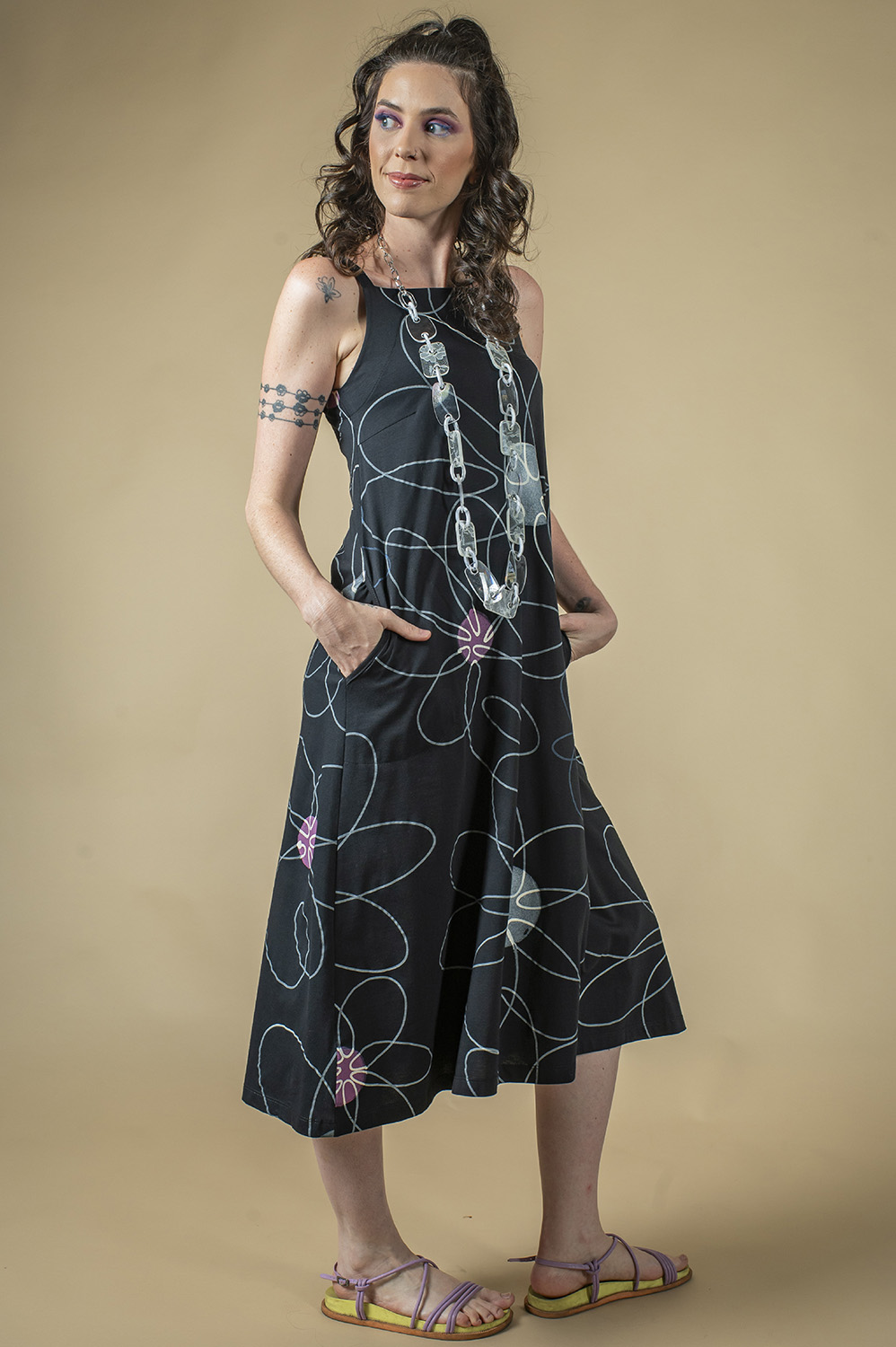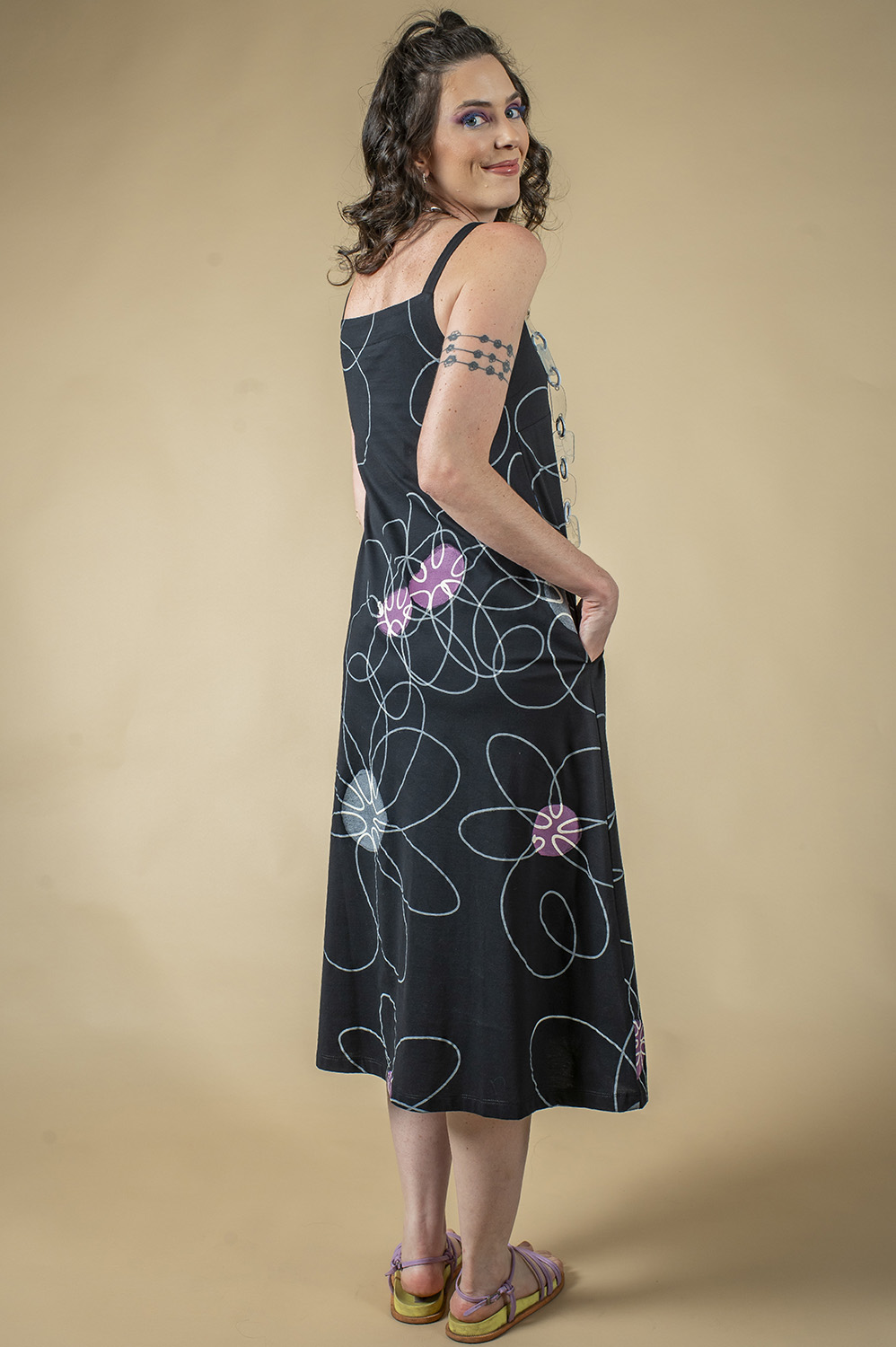 VESTIDO MIDI DE ALÇA, DECOTE RETO, LEVEMENTE LINHA A, COM BOLSOS