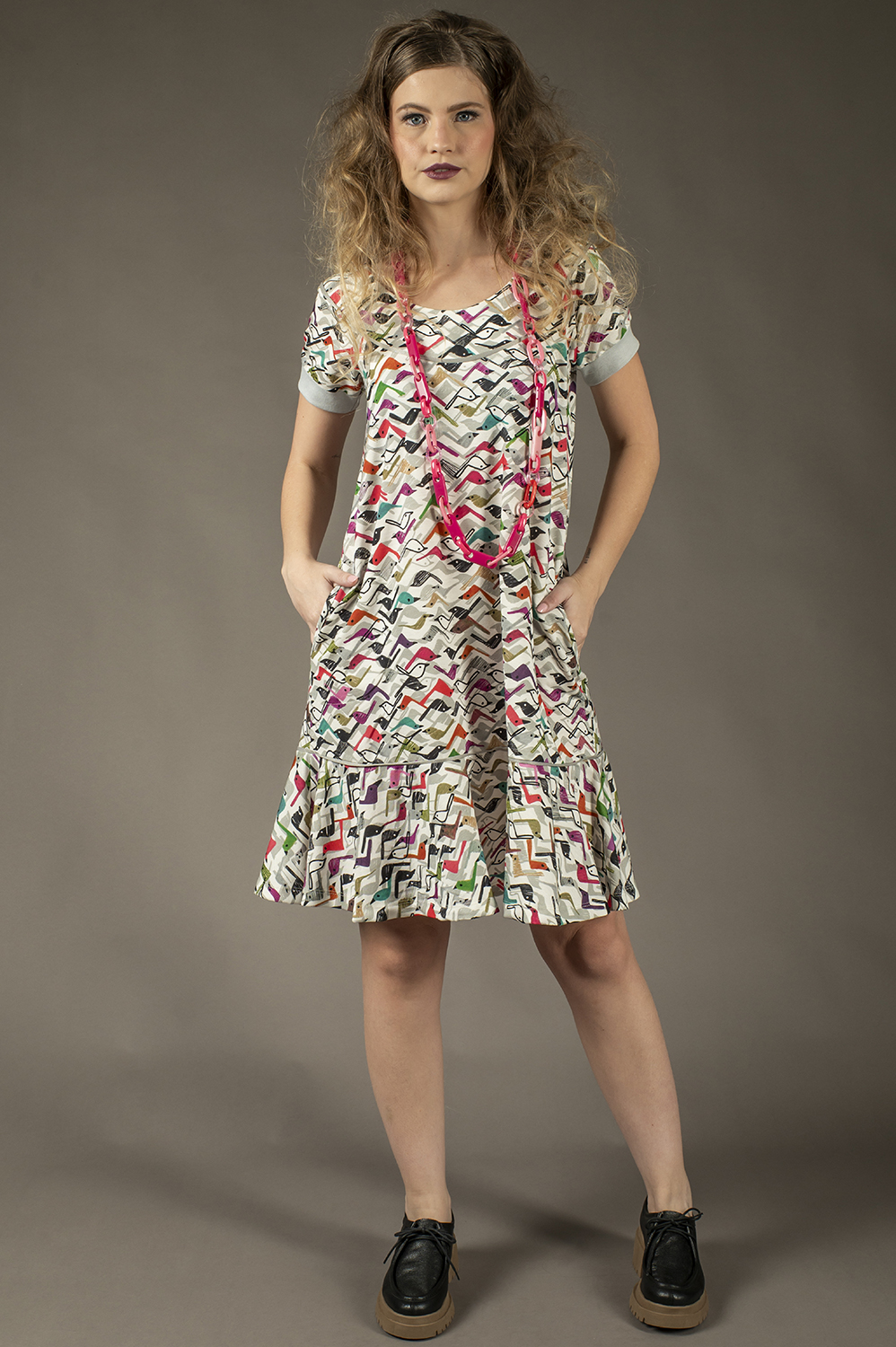 VESTIDO NO JOELHO, SOLTINHO, COM DECOTE REDONDO, MANGA CURTA E RECORTE COM BABADO NA BARRA