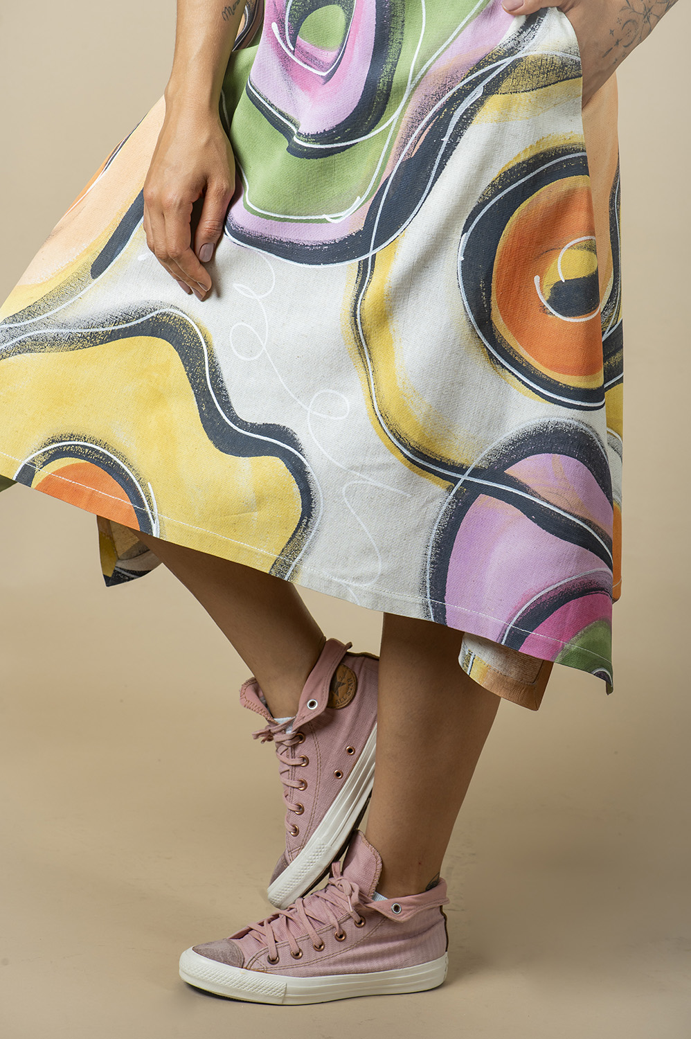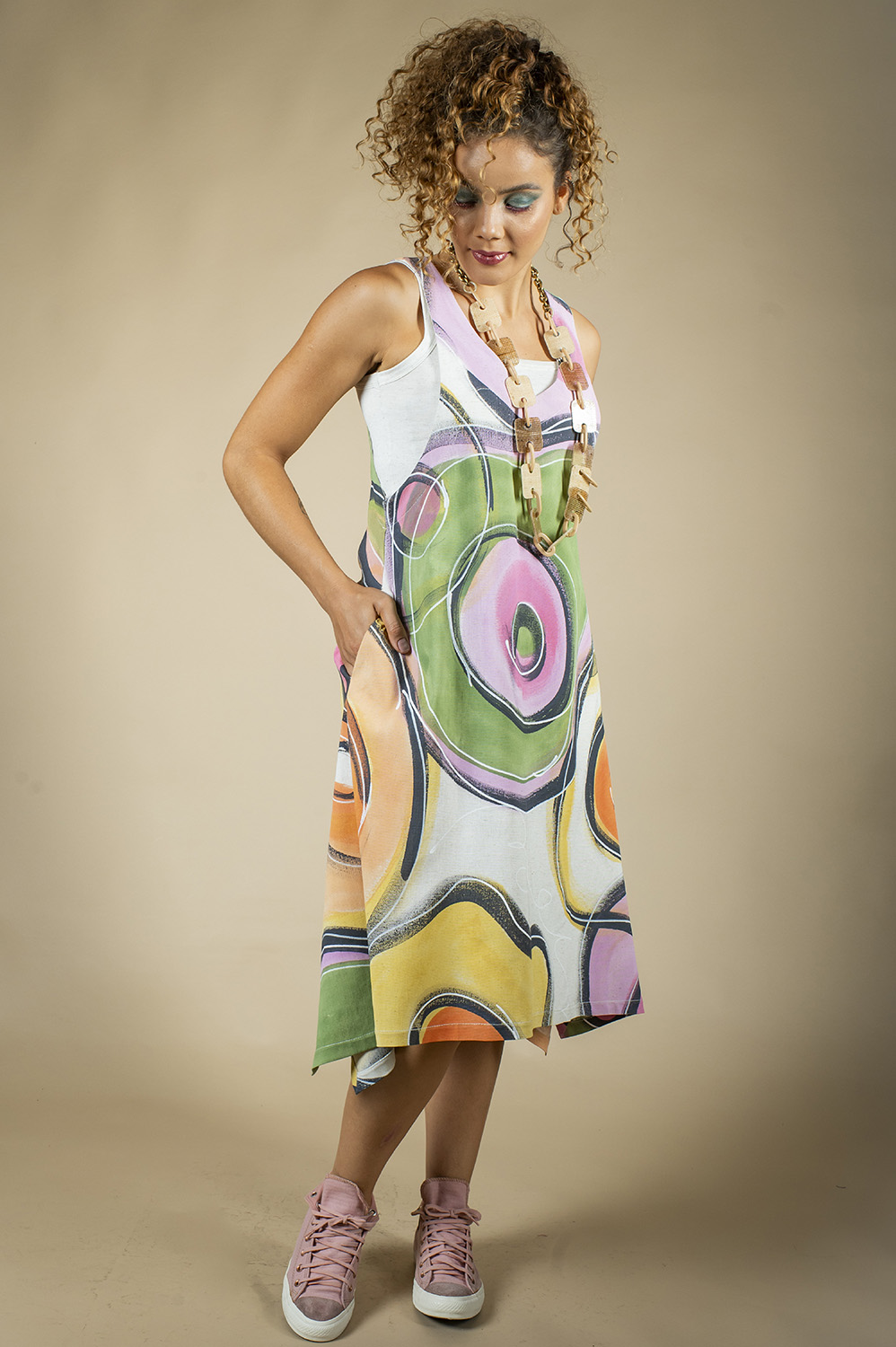 VESTIDO PINTADO À MÃO REGATA, COM SUPER CAVA E PONTAS LATERAIS