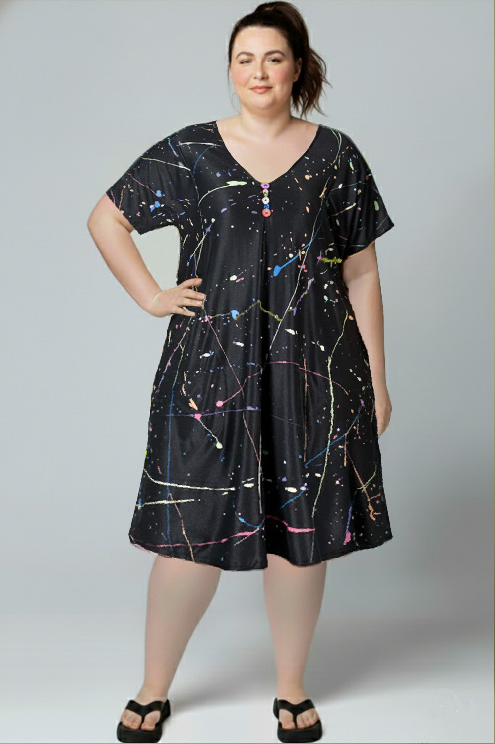 VESTIDO PLUS SIZE, ABAIXO DO JOELHO COM DECOTE QUADRADO, MANGA CURTA E RECORTE NA CINTURA