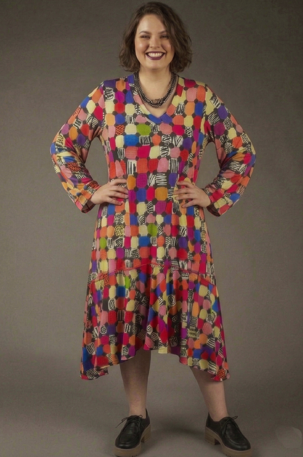 VESTIDO PLUS SIZE MANGA LONGA, COM DECOTE V, SOLTINHO COM SUPER RECORTE NA SAIA