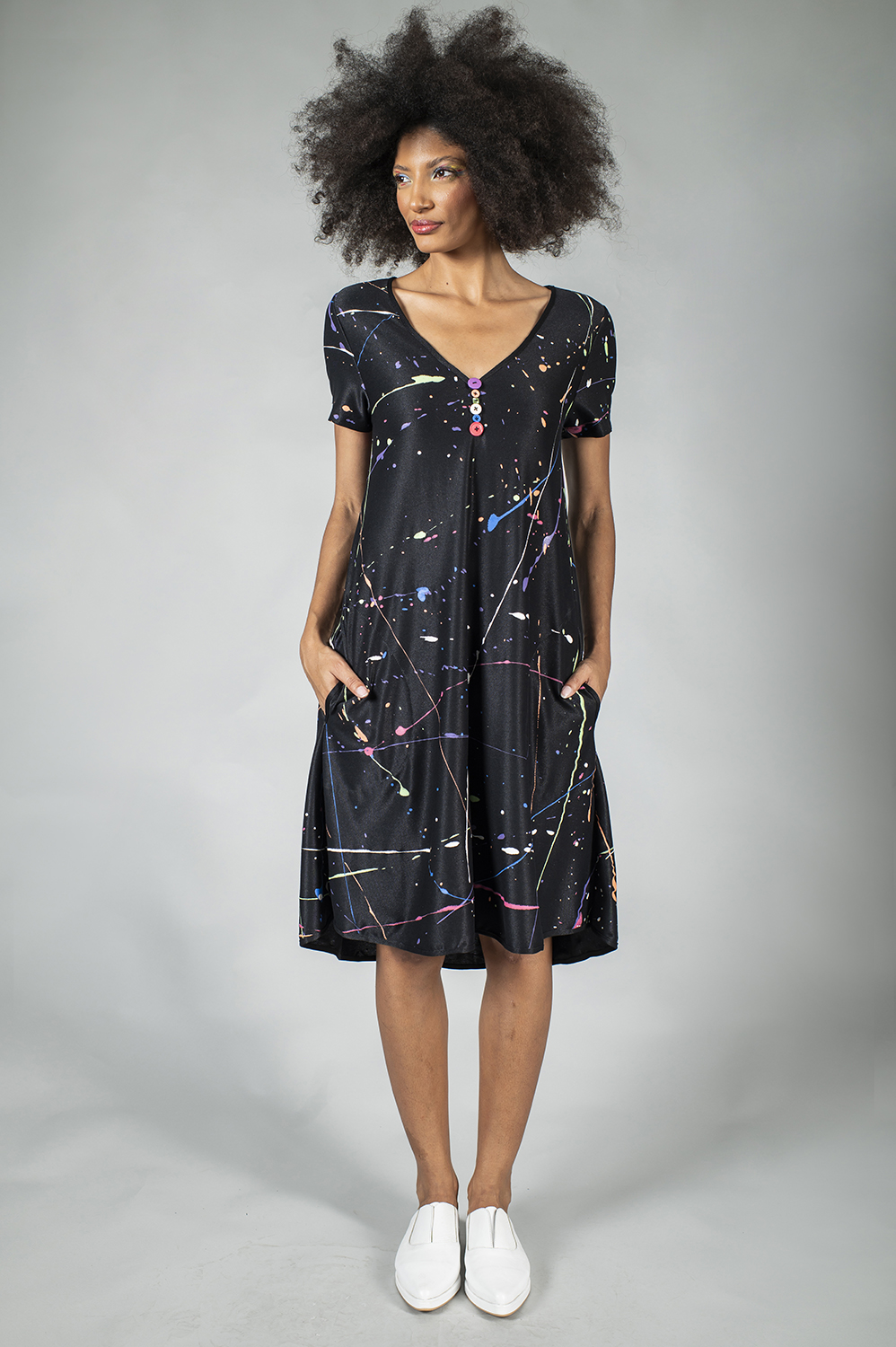VESTIDO PLUS SIZE PINTADO À MÃO EVASÉE, DE MANGA CURTA, DECOTE V COM DETALHE DE BOTÕES